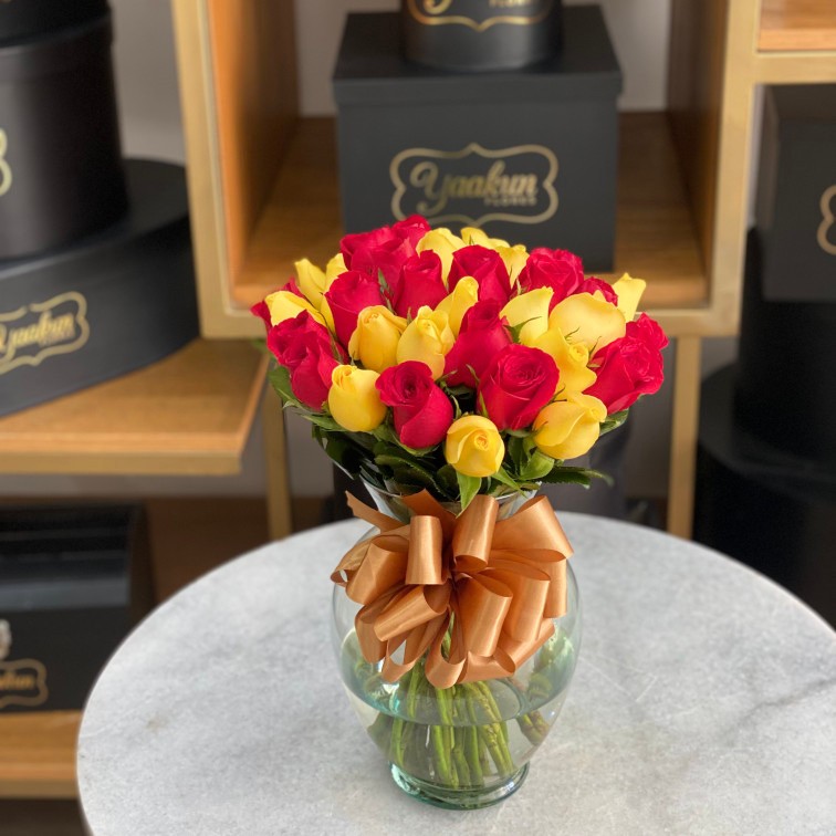 Arreglo floral en jarrón con 36 roas rojas y amarillas