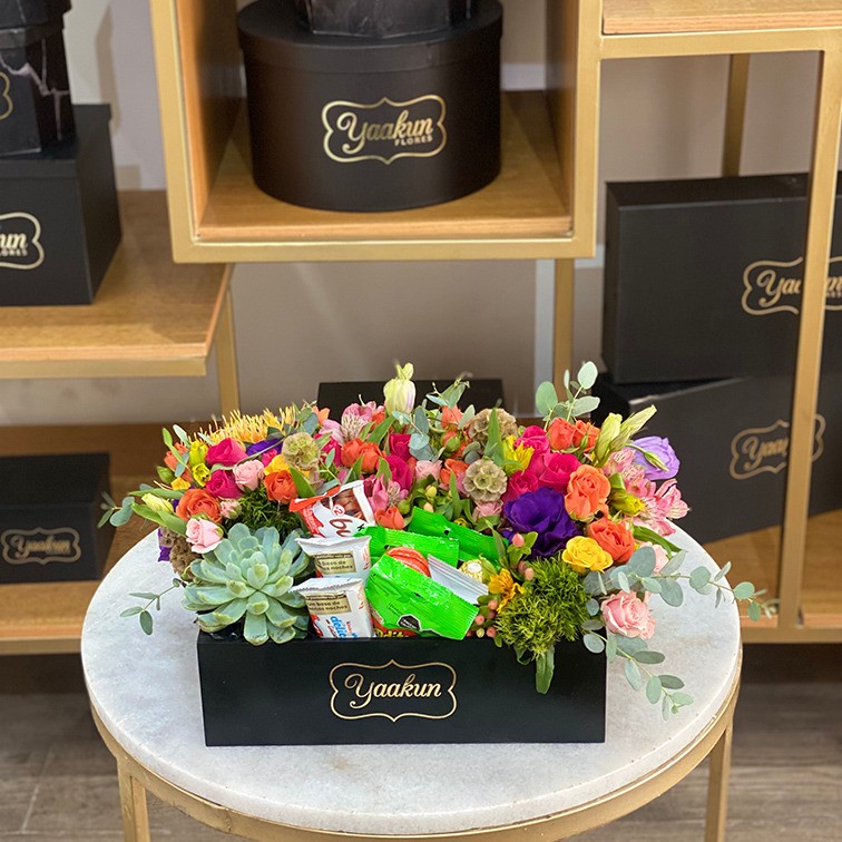 Caja Yaakun con una variedad de flores exóticas y dulces Ricolino.