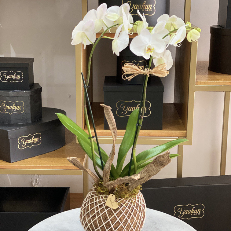Hermoso y elegante arreglo floral de orquídea phalenosis blanca en maceta de kokedama con forma hecha artesanalmente con fibra de coco totalmente ecológica.