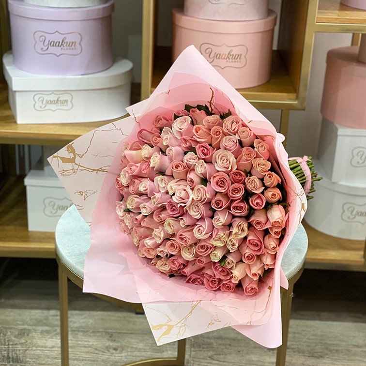 Hermoso y tierno bouquet de 100 rosas en tonos pasteles con papel coreano