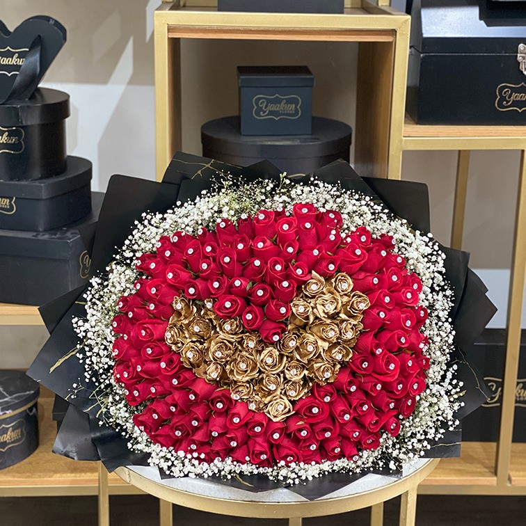 Hermoso y elegante diseño floral tipo bouquet con 150 rosas, corazón dorado al centro y decorado con pines y detalles de gypso en papel coreano