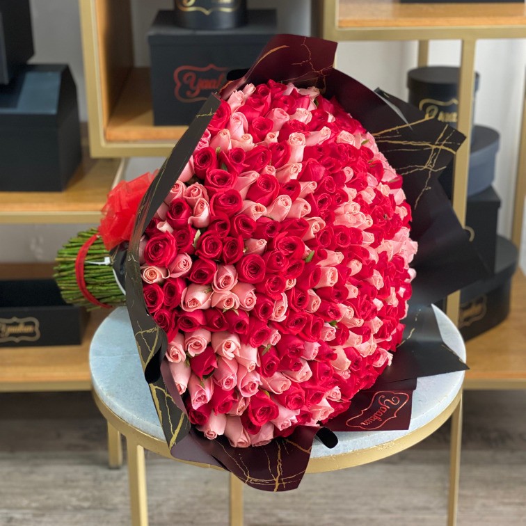 Hermoso y elegante arreglo floral tipo bouquet con 200 rosas en tono rojo y rosa