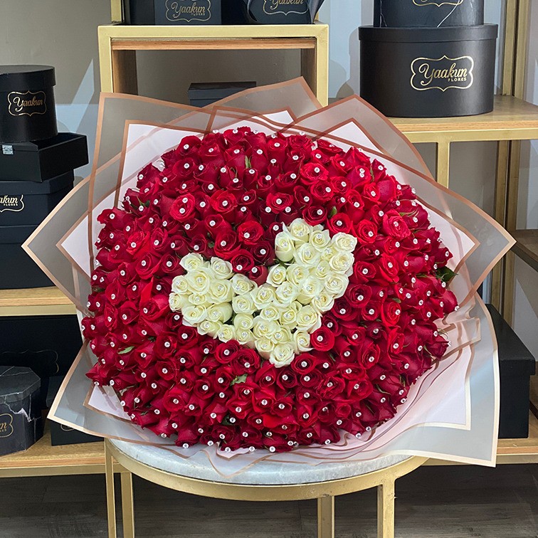 Espléndido ramo de 250 rosas rojas con un corazón blanco al centro y pines con calidad de exportación.