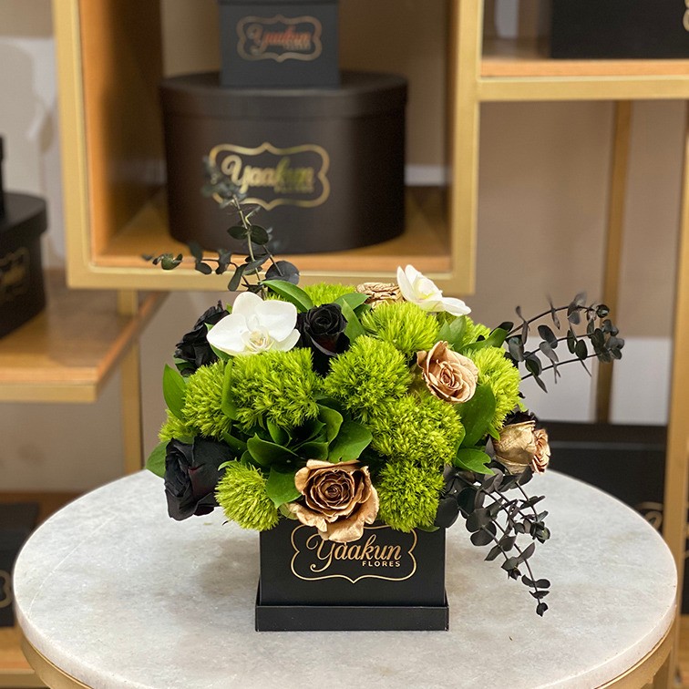 Mini caja negra Yaakun con rosas doradas, negras, follaje dólar y orquídeas.