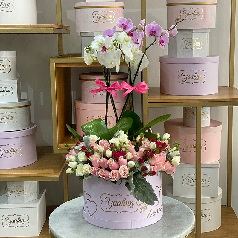 Orquídeas serán las que conquisten el gusto más exigente, sera el indicado para regalar a esa persona tan especial. Este diseño en caja circular lila edición especial Yaakun, está conformada por 2 macetas de orquídeas phalenopsys de doble vara, diseño floral en sutiles tonos rosados y lilas (36 rosas), mini rosas, listón de Satin y follaje fino. Diámetro de caja 35 cm