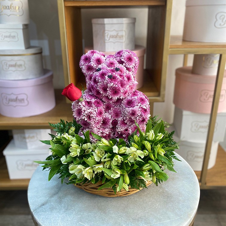 Este tierno diseño enamora con sólo verlo. Elaborado con morelianas, alstroemerias y una rosa roja, montado sobre una canasta. Tiene una altura promedio de 40 cm