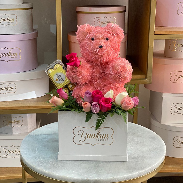 Tierno diseño en forma de oso hecho de morelianas, rosas y con chocolates Ferrero.