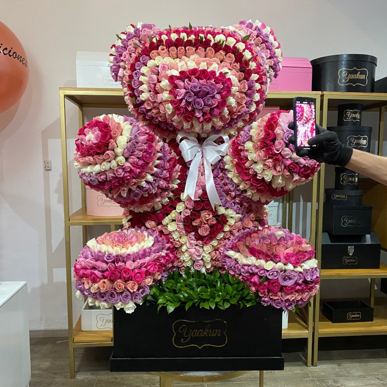 Hermosa escultura en forma de oso con 2200 rosas aproximadamente en diferentes tonos