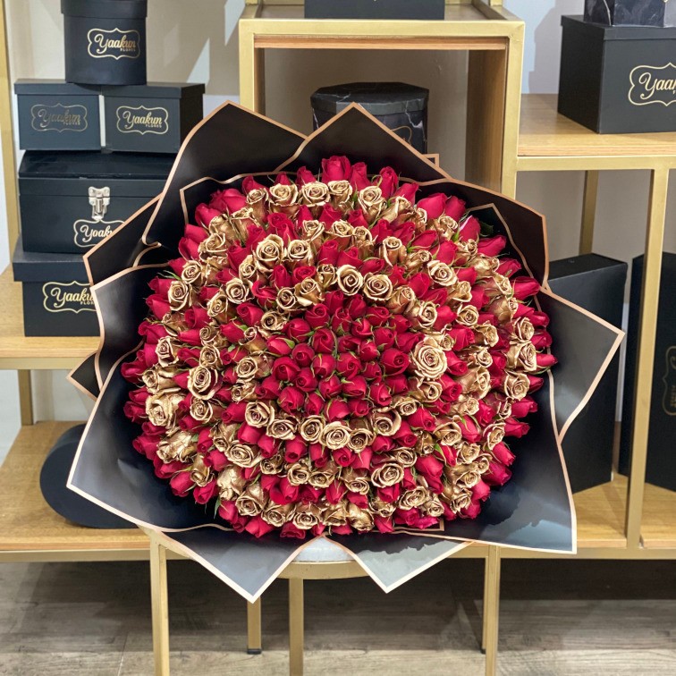 Elegante bouquet de 220 rosas rojas y rosas doradas.