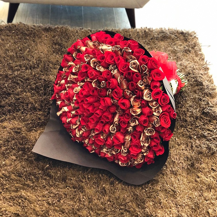 Haz sentir a esa persona la más especial del mundo con este maravilloso ramo de 220 rosas rojas y rosas doradas en círculos.