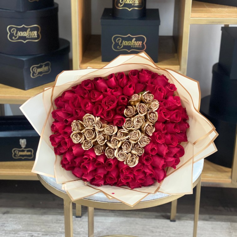 Ramo de 100 rosas rojas con un corazón de rosas dorados en el centro.