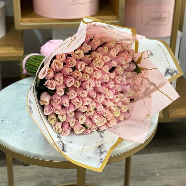 Hermoso ramo de 100 rosas rositas con un con calidad de exportación, con papeles coreanos