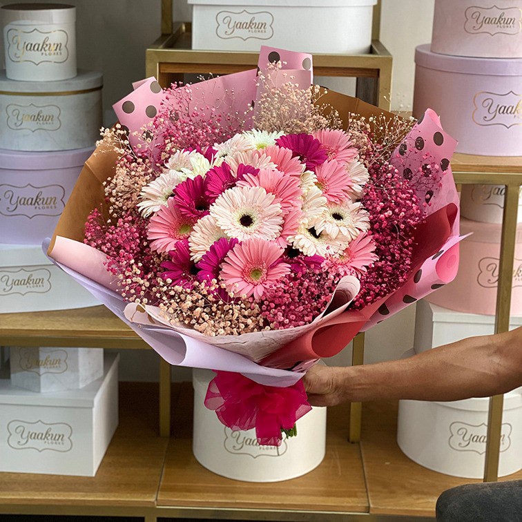 Hermoso y tierno bouquet con 36 gerberas y detalles en gypso en tonos rosas con papel coreano