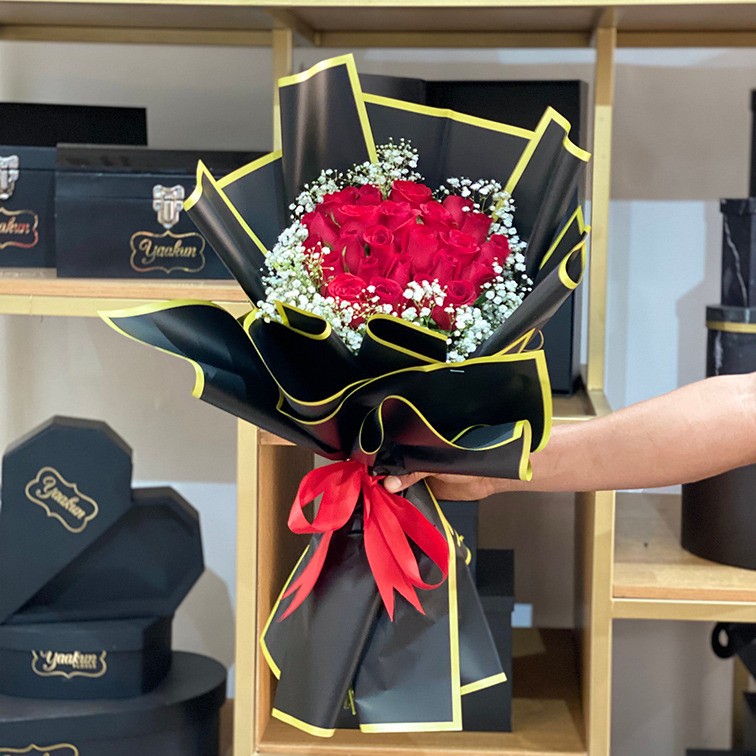 Hermoso y clásico ramo de 24 rosas rojas y gypso con papel celofán