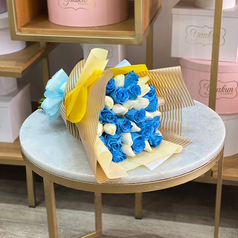 Hermoso arreglo tipo bouquet con 36 rosas blancas y azules envueltos en elegante papel coreano