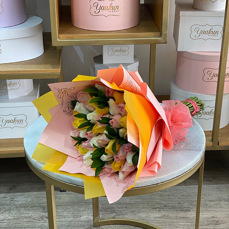 Hermoso arreglos floral tipo bouquet con tonos rosa , amarillo y blanco con follajes y papel