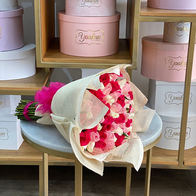 Este precioso ramo cuenta con 25 rosas blancas, 25 rosas fucsia, 25 rosas en tono pastel, yute y un moño fucsia de organza.