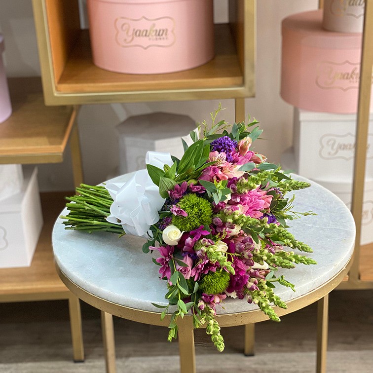 Da el primer paso con este hermoso ramo con rosas lilas, leticias moradas, alstroemerias blancas, margaritas, mantthiolas moradas, green, follaje guny, yute y un moño de organza.