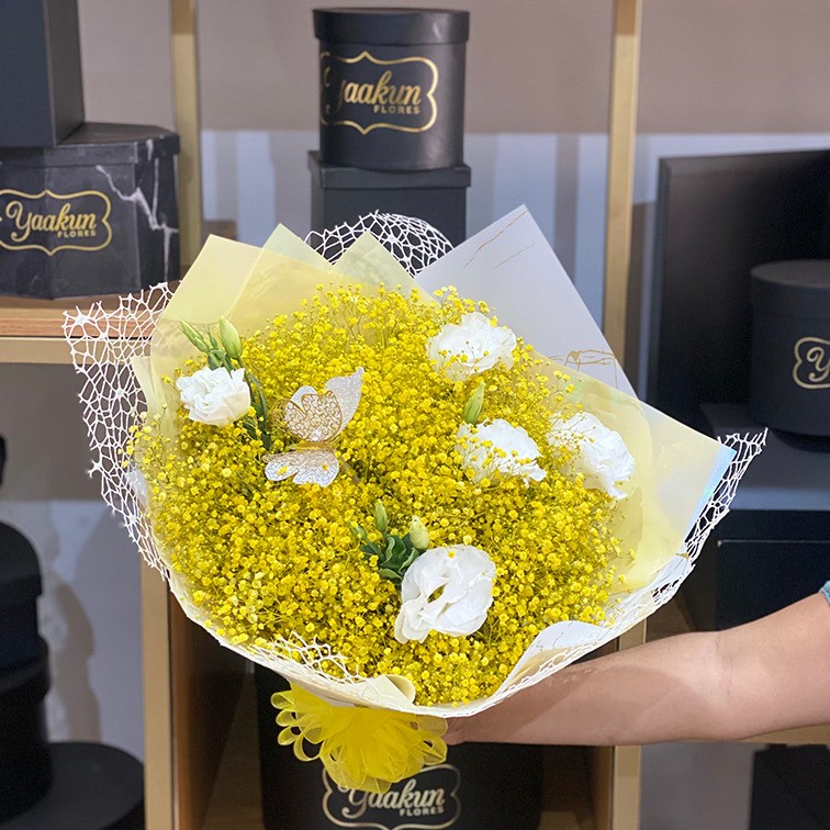 Hermoso y sencillo arreglo floral con gypso amarilla y 2 mariposas