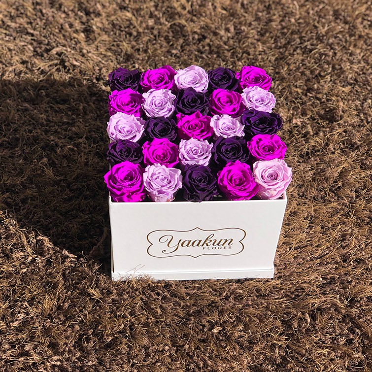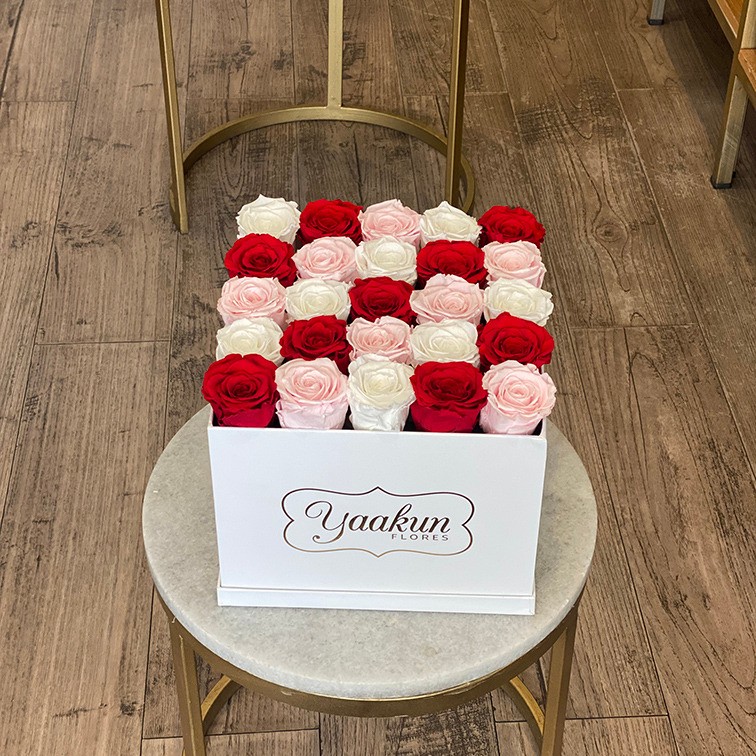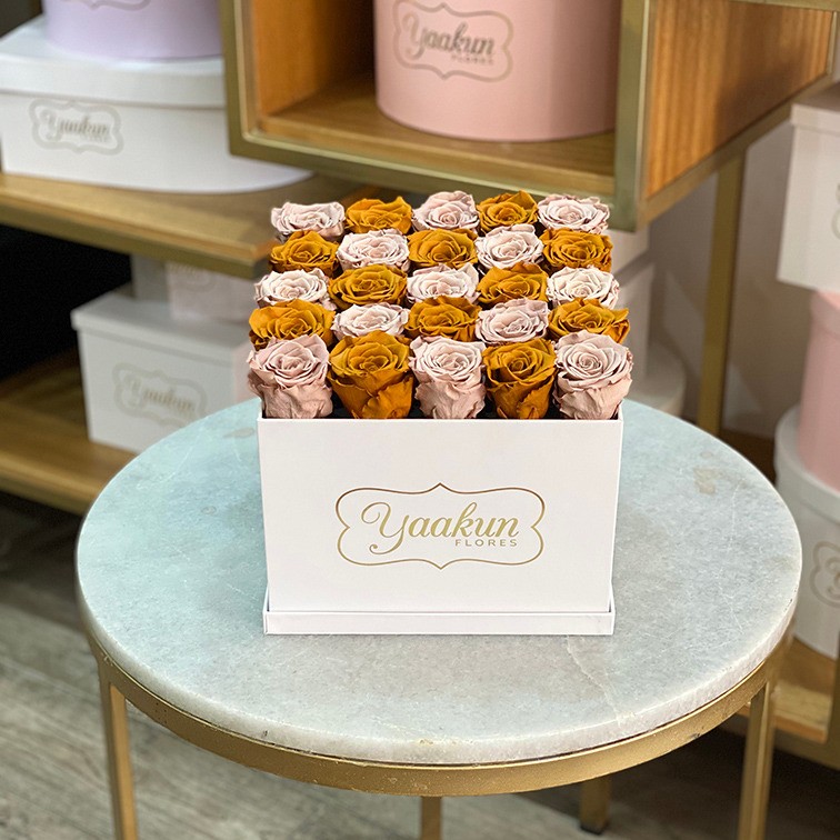Hermosa caja blanca con 25 rosas eternas ocre y nude.