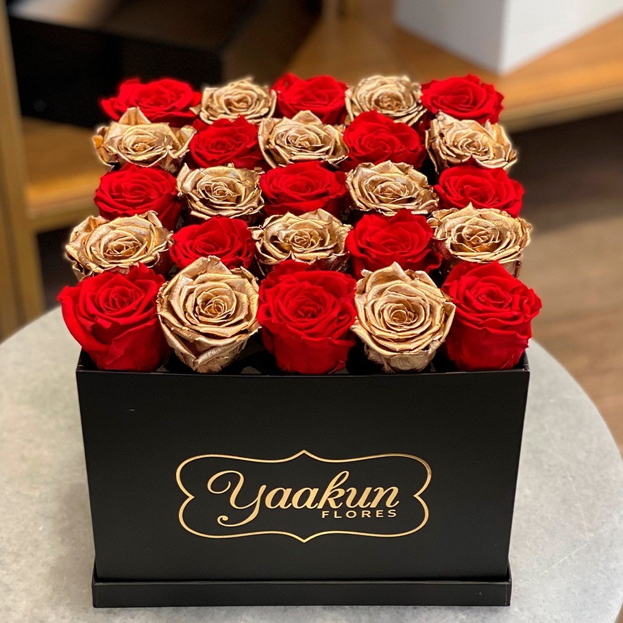 Hermosa caja negra con 25 rosas eternas rojas y doradas.