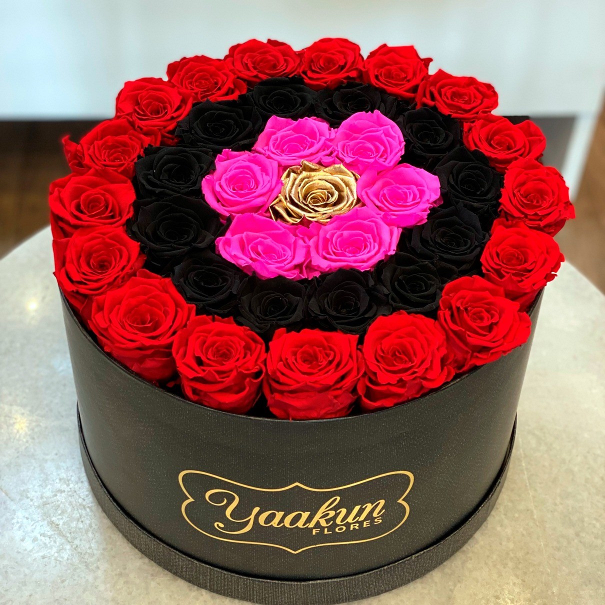 Hermoso diseño con aproximadamente 36 rosas preservadas rojas, negras y doradas en caja circular negra. Las rosas preservadas pueden durar hasta 3 años dependiendo los cuidados y las condiciones climatológicas de cada ciudad.