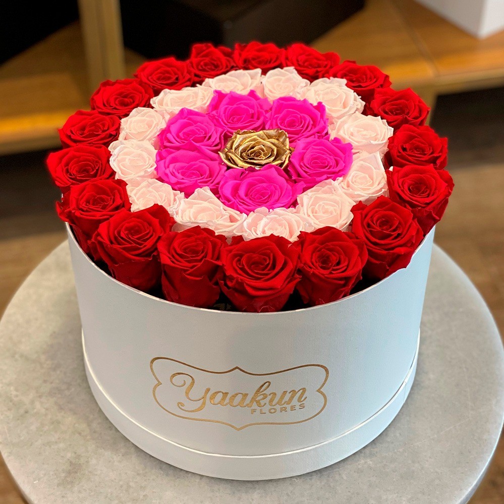 Caja circular blanca con aproximadamente 36 rosas preservadas rojas, rosas y doradas. Las rosas preservadas pueden durar hasta 3 años dependiendo los cuidados y las condiciones climatológicas de cada ciudad.