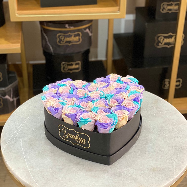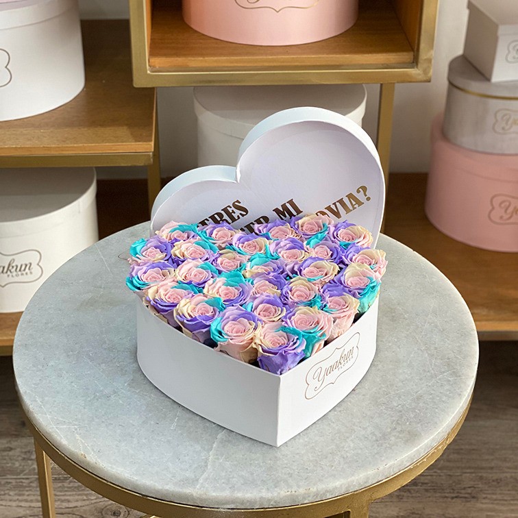 Hermoso diseño floral en forma de corazón con 27 rosas aprox tierno arcoíris , pudieran llegar a durar hasta 2 años dependiendo del cuidado