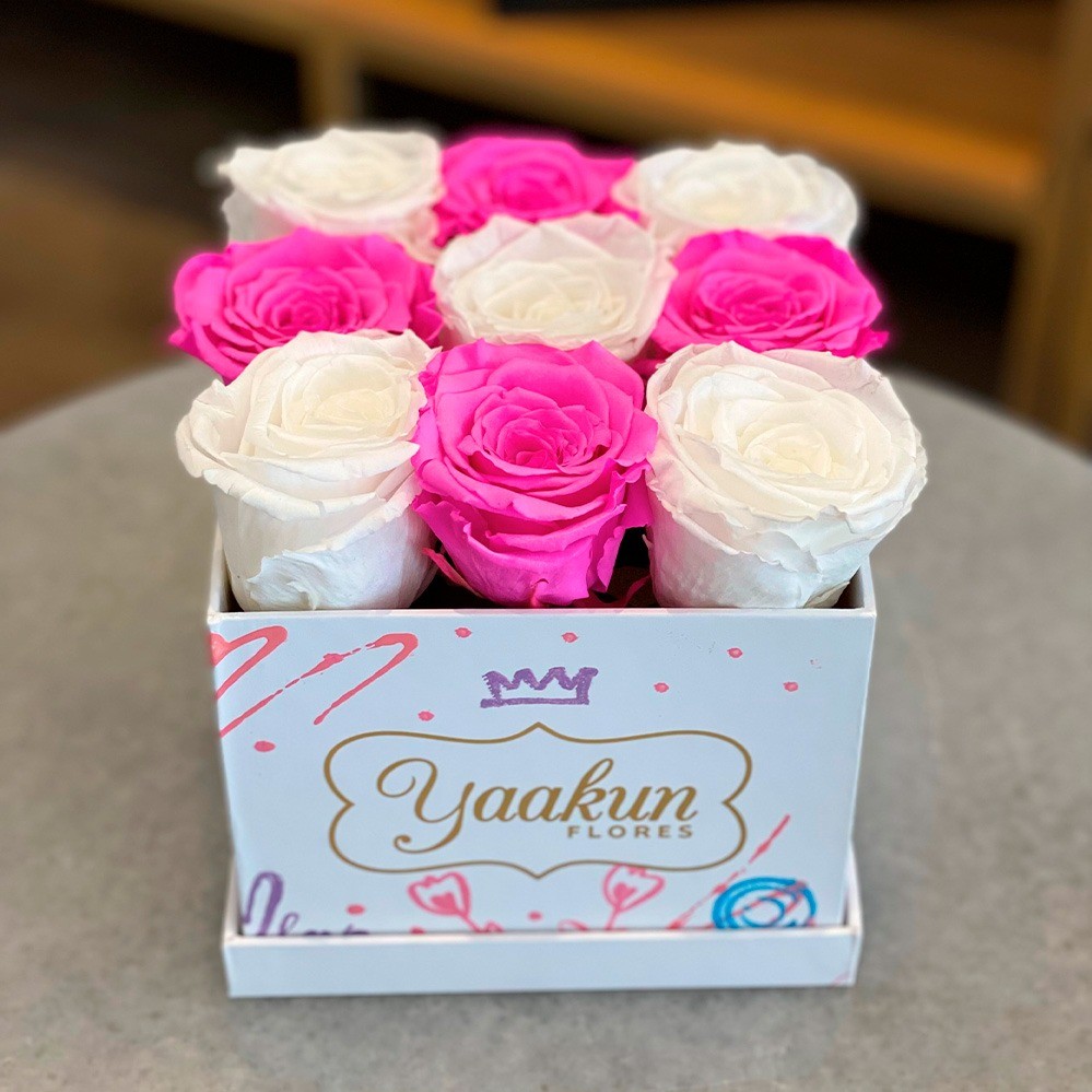 Caja cuadrada edición especial con 9 rosas preservadas en tonos fuchsia y blancos. Las rosas preservadas pueden durar hasta 3 años dependiendo los cuidados y las condiciones climatológicas de cada ciudad.