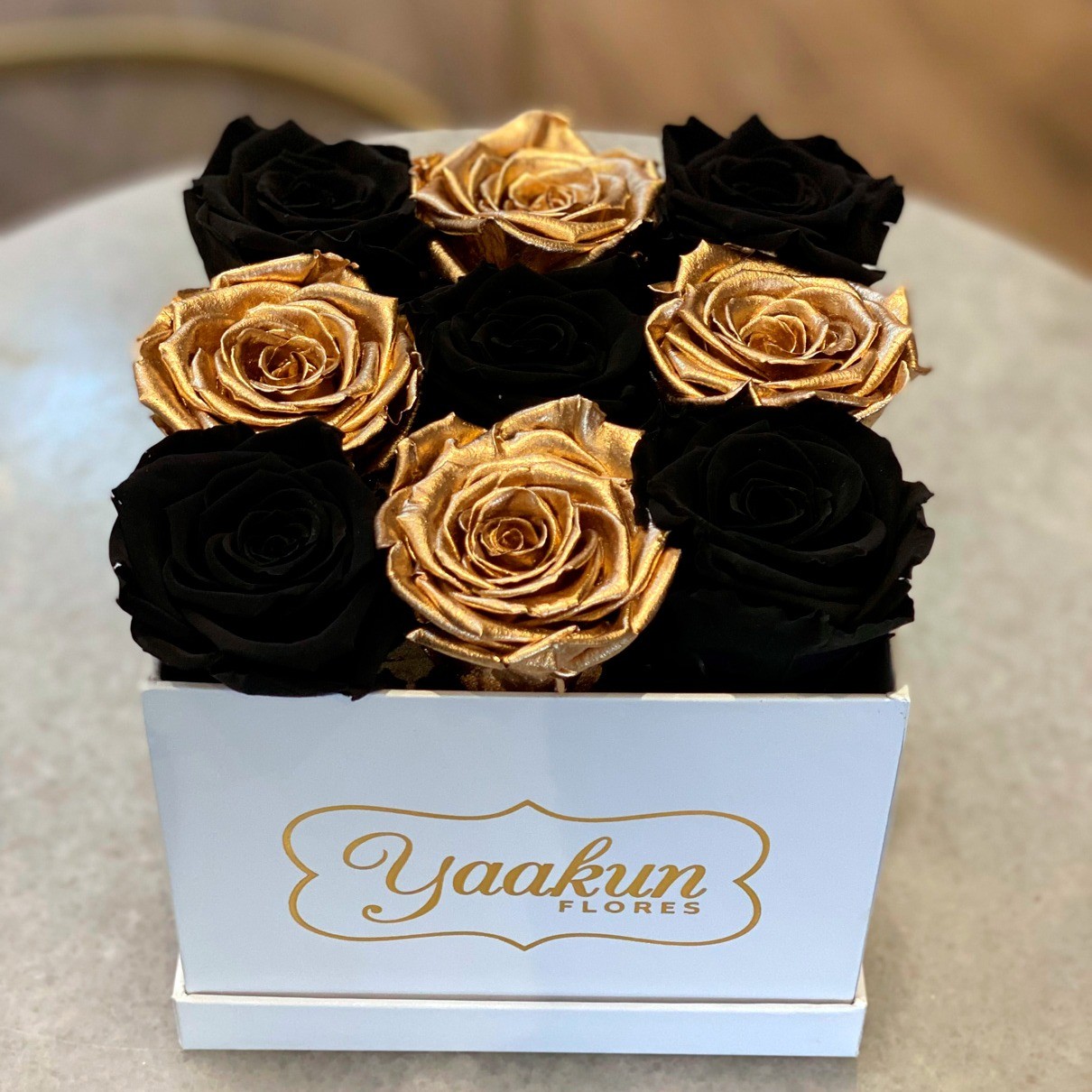 Caja blanca chica con 9 rosas preservadas en color negro y dorado. Las rosas preservadas pueden durar hasta 3 años dependiendo los cuidados y las condiciones climatológicas de cada ciudad.