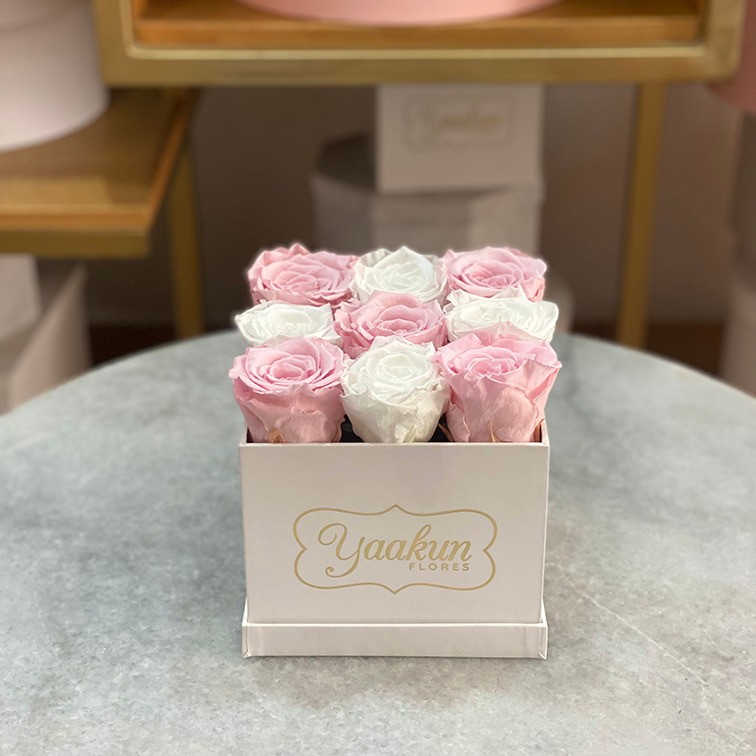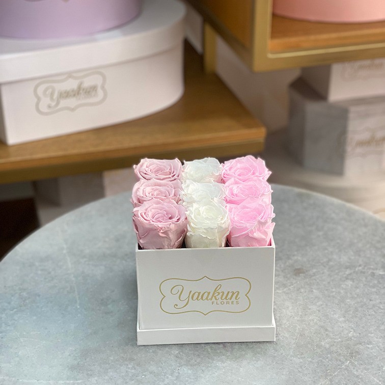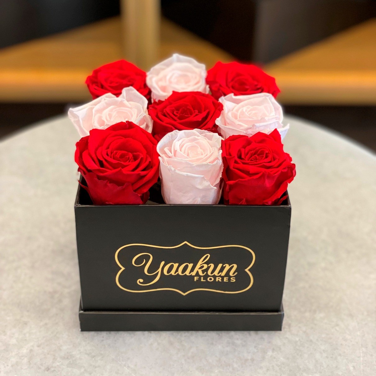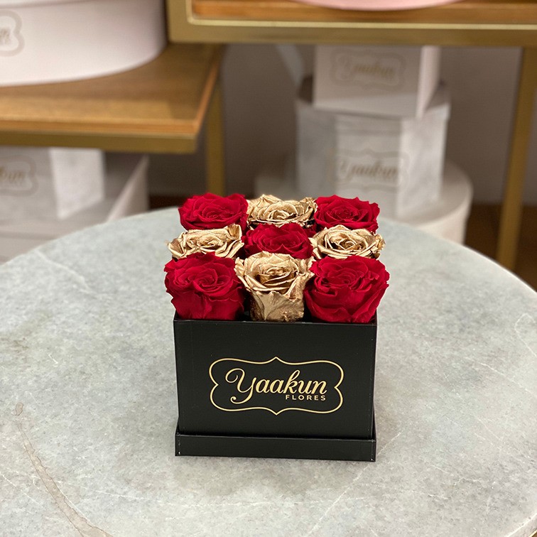 Caja negra chica con 9 rosas preservadas en color rojo y dorado. Las rosas preservadas pueden durar hasta 3 años dependiendo los cuidados y las condiciones climatológicas de cada ciudad.