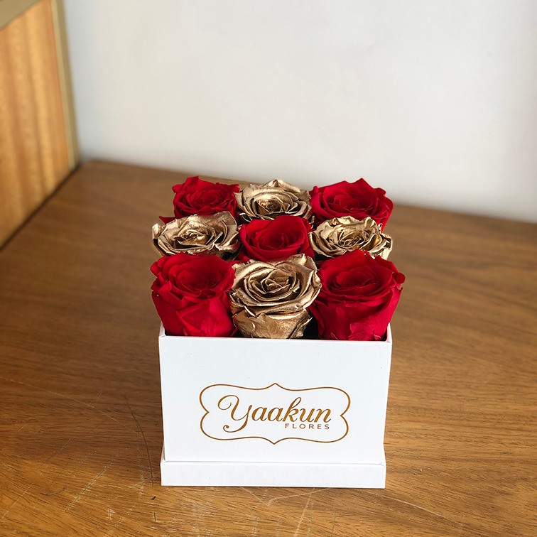 Hermoso diseño floral con 9 rosas eternas aprox rojas y doradas, pudieran llegar a durar hasta 2 años dependiendo del cuidado