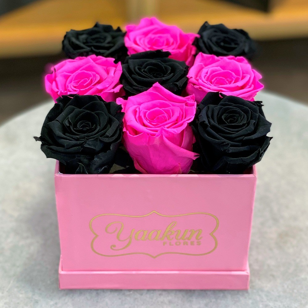 Caja cuadrada rosa con 9 rosas preservadas en tonos fucsia y negro. Las rosas preservadas pueden durar hasta 3 años dependiendo los cuidados y las condiciones climatológicas de cada ciudad.
