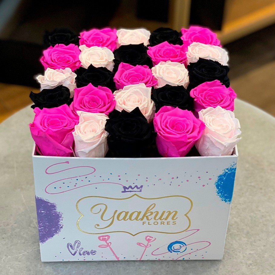 Caja cuadrada edición especial con 25 rosas preservadas en tonos rosas, lila y negros. Las rosas preservadas pueden durar hasta 3 años dependiendo los cuidados y las condiciones climatológicas de cada ciudad.