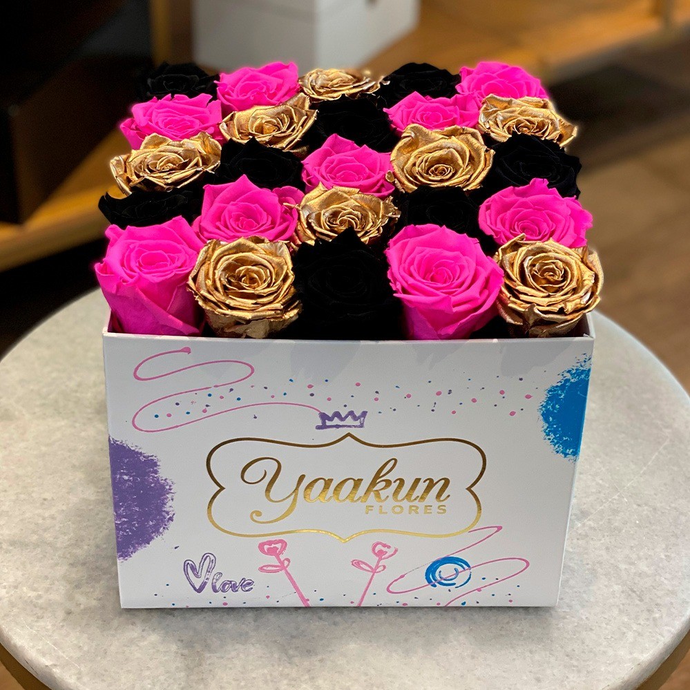 Caja cuadrada edición especial con 25 rosas preservadas en tonos rosa, dorado y negro. Las rosas preservadas pueden durar hasta 3 años dependiendo los cuidados y las condiciones climatológicas de cada ciudad.