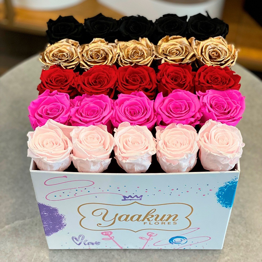 Caja cuadrada edición especila con 25 rosas preservadas en tonos lila, rosa, rojos, dorados y negro. Las rosas preservadas pueden durar hasta 3 años dependiendo los cuidados y las condiciones climatológicas de cada ciudad.