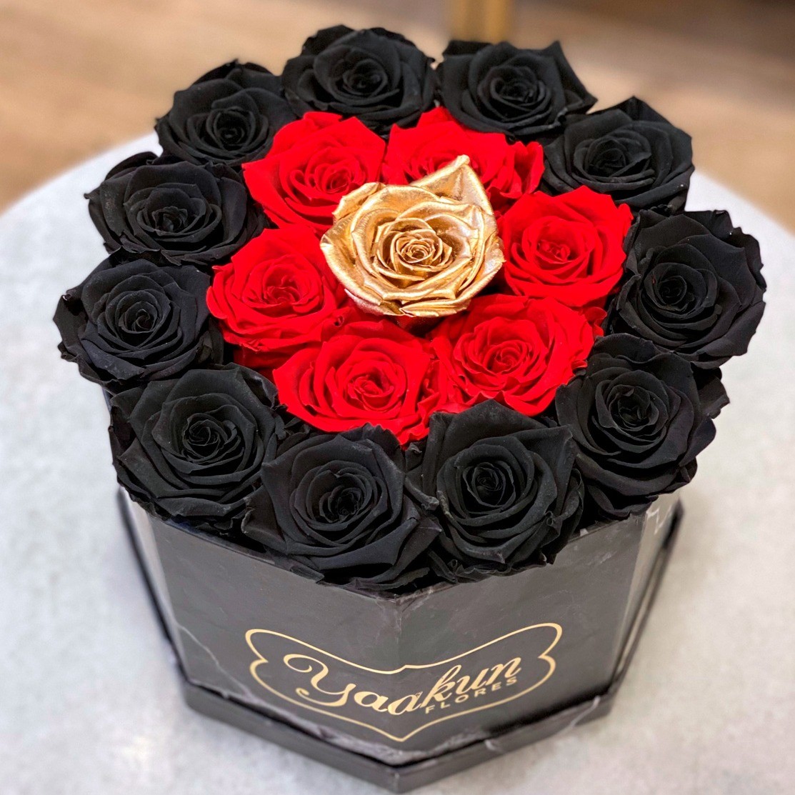 Caja octagonal negra marmolada con aproximadamente 17 rosas en color rojo, negro y dorado. Las rosas preservadas pueden durar hasta 3 años dependiendo los cuidados y las condiciones climatológicas de cada ciudad.