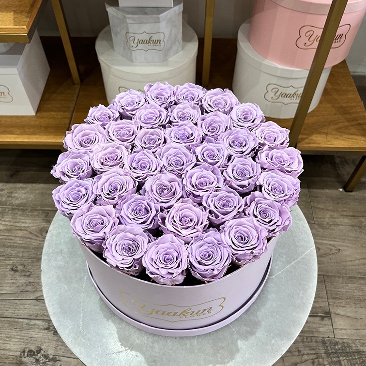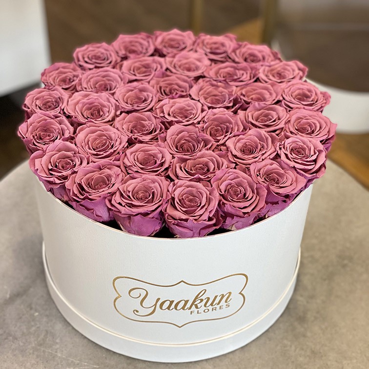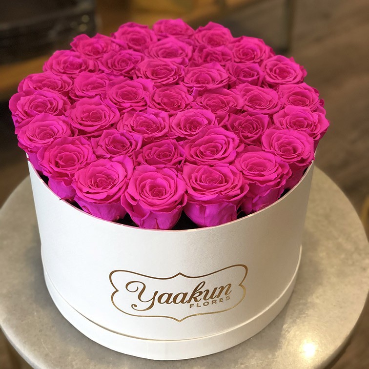Caja circular blanca con 36 rosas eternas aproximadamente en color fucsia