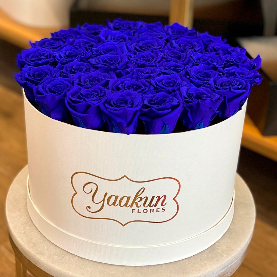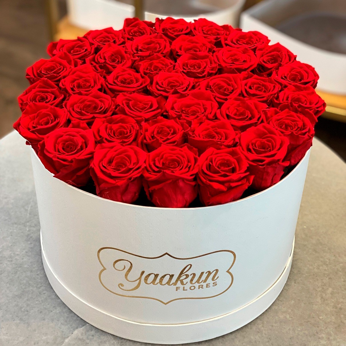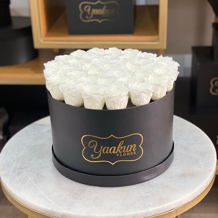 Caja circular negra con aproximadamente 36 rosas preservadas blanca. Las rosas preservadas pueden durar hasta 3 años dependiendo los cuidados y las condiciones climatológicas de cada ciudad.