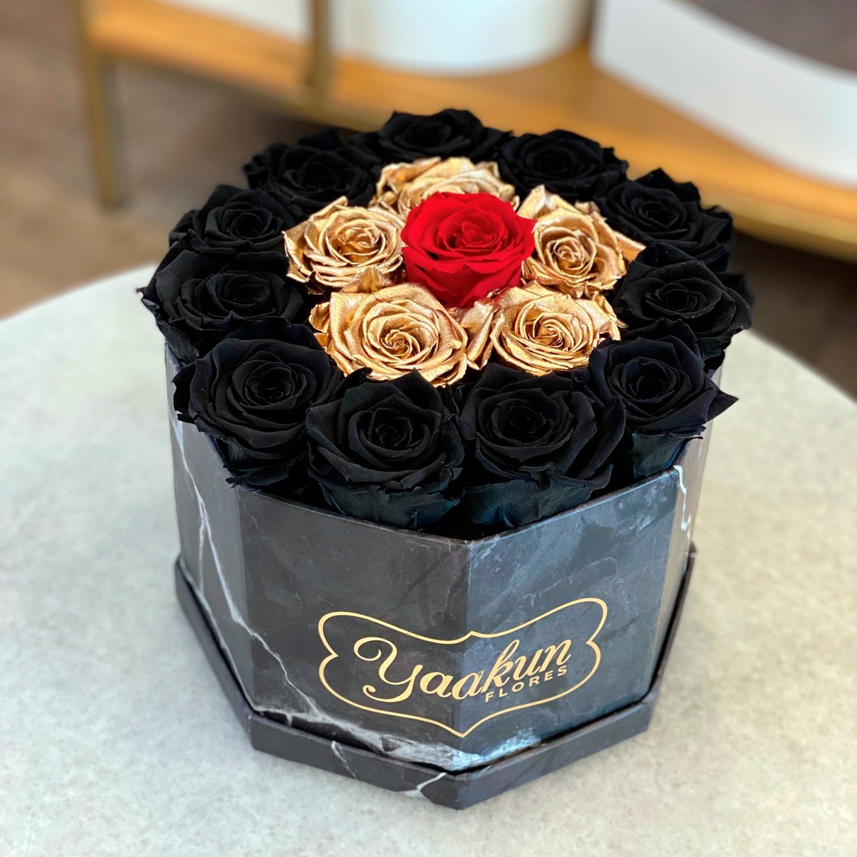 Caja exagonal marmolada negra con aproximadamente 17 rosas preservadas en color negro, dorado y rojo. Las rosas preservadas pueden durar hasta 3 años dependiendo los cuidados y las condiciones climatológicas de cada ciudad.