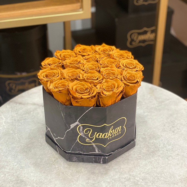 Hermoso diseño en caja octagonal negra de cartón rígido con 18 rosas eternas aproximadamente, en tono ocre