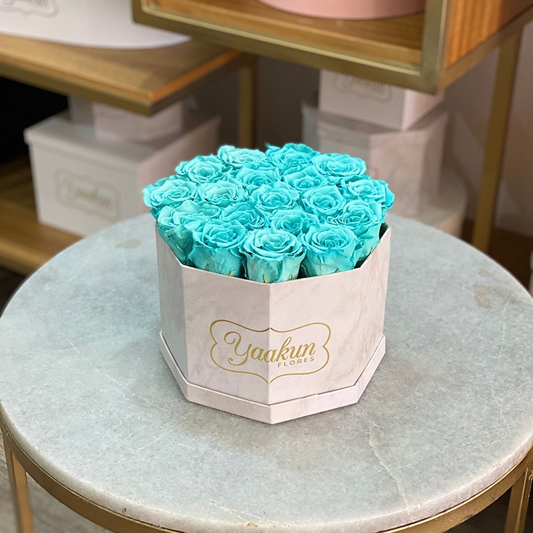 Hermoso diseño en caja octagonal blanca de cartón rígido con 18 rosas eternas aproximadamente, en tono azul aqua.