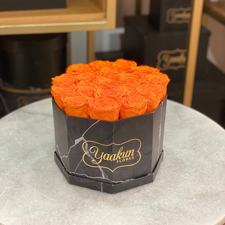 Hermoso diseño en caja octagonal negra de cartón rígido con 18 rosas eternas aproximadamente, en tono naranja