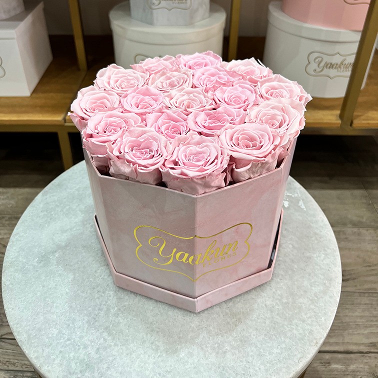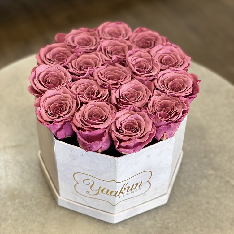 Hermoso diseño en caja octagonal rosita de cartón rígido con 18 rosas eternas aproximadamente, en tono rosita.