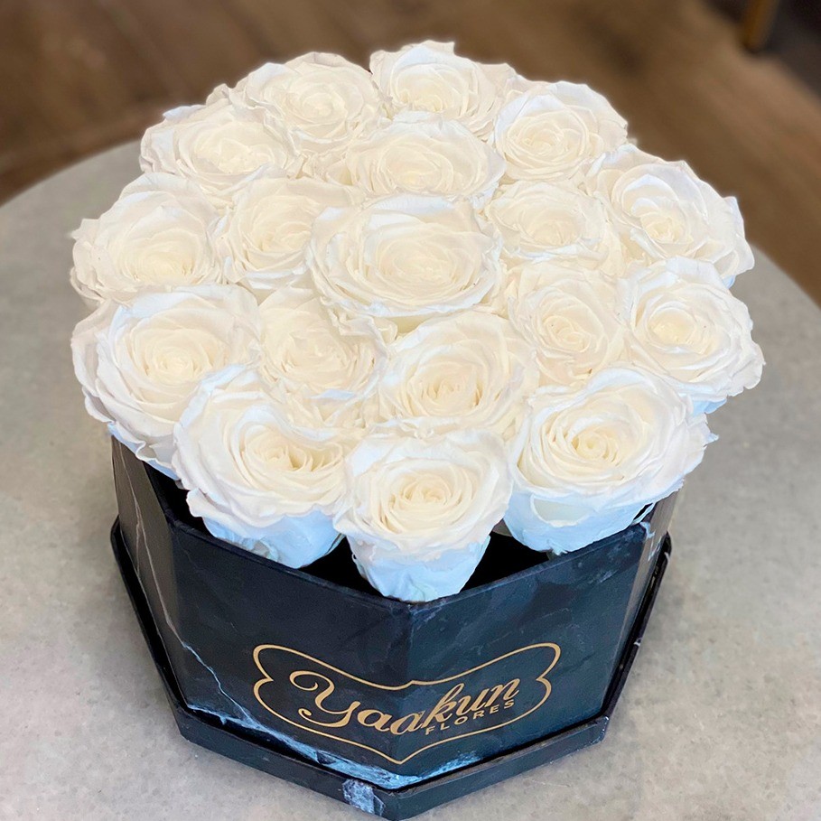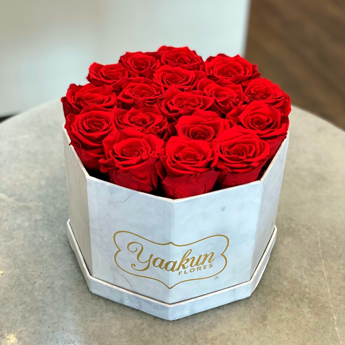 Hermosa caja octagonal marmolada negra con aproximadamente 17 rosas preservadas rojas. Las rosas preservadas pueden durar hasta 3 años dependiendo los cuidados y las condiciones climatológicas de cada ciudad.