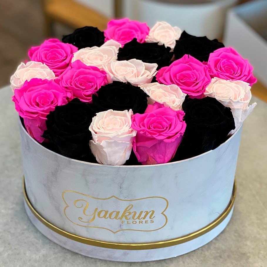 Caja ovalada blanca marmolada con aproximadamente 17 rosas preservadas en tonos rosa, lila y negras. Las rosas preservadas pueden durar hasta 3 años dependiendo los cuidados y las condiciones climatológicas de cada ciudad.