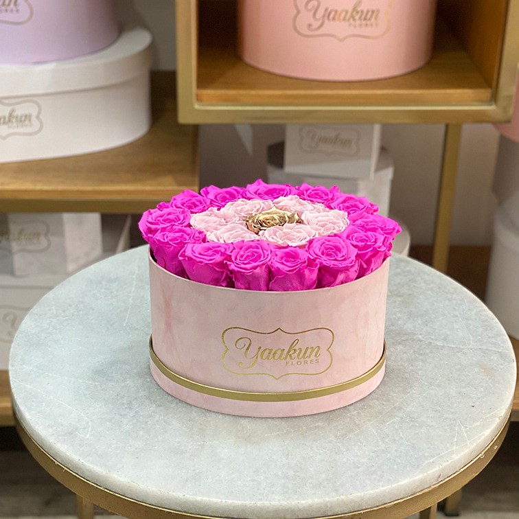 Hermoso arreglo con aproximadamente 17 rosas preservadas rojas y doradas en caja ovalada color rosa marmolada. Las rosas preservadas pueden durar hasta 3 años dependiendo los cuidados y las condiciones climatológicas de cada ciudad.