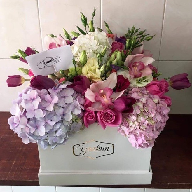 Obsequia esta hermosa caja en color blanco con orquídeas, rosas, hortensias, tulipanes, lisiantus y follaje fino.