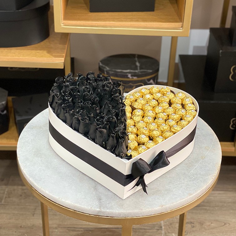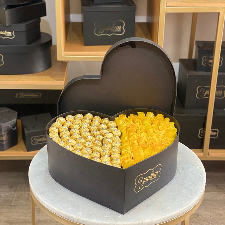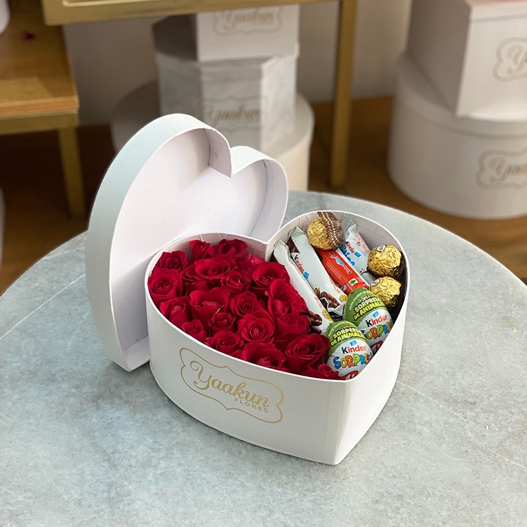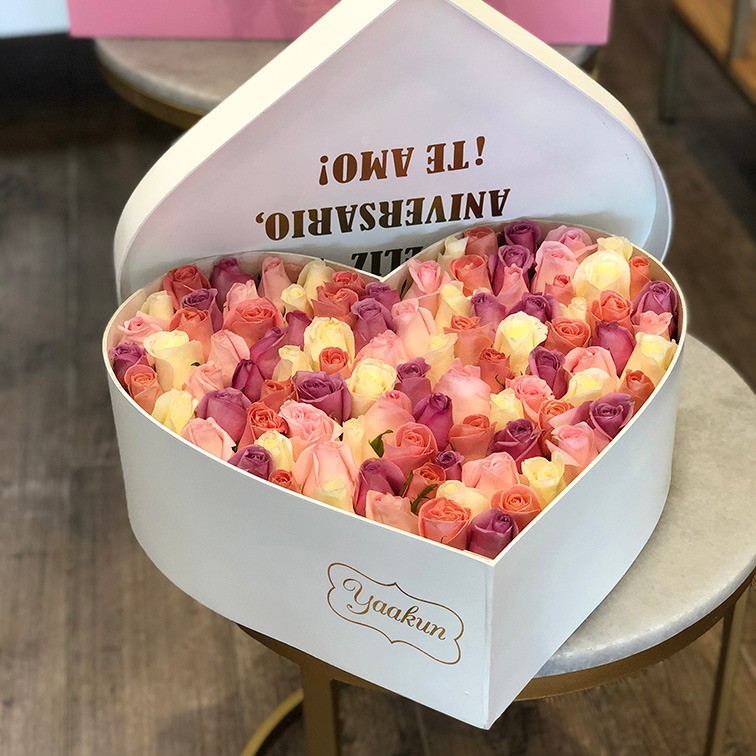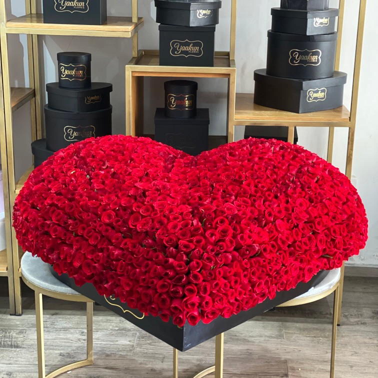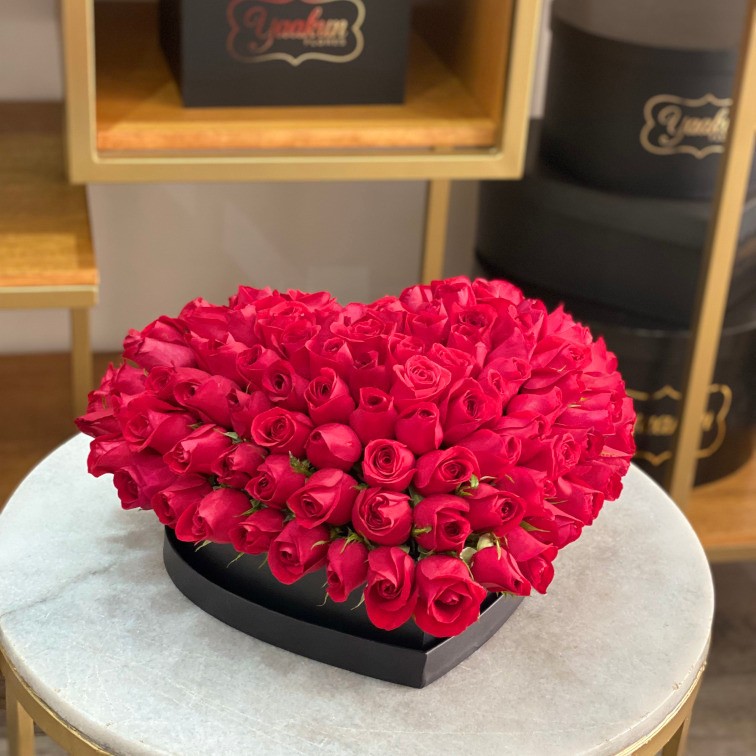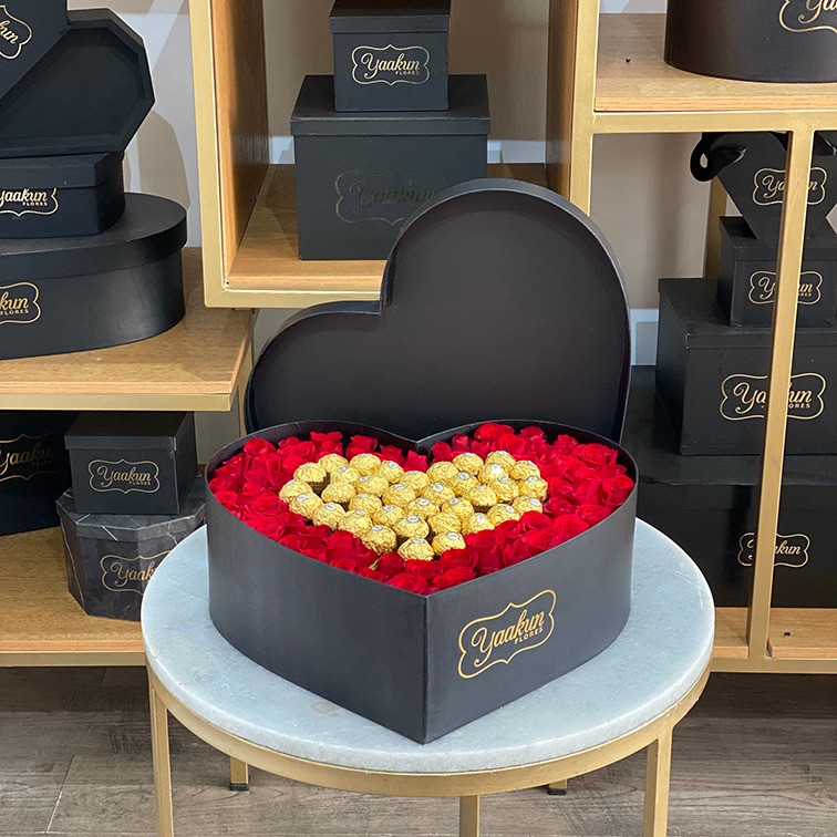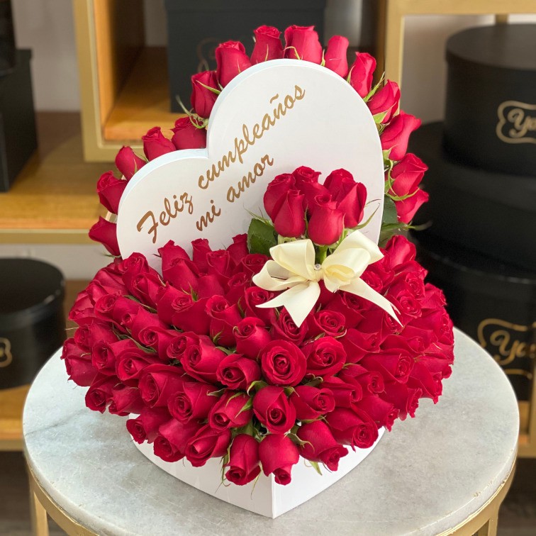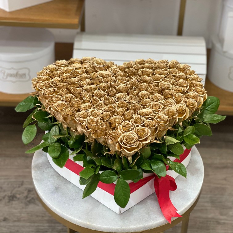 Hermoso arreglo floral en caja de corazón dorado con rosas rojas altas