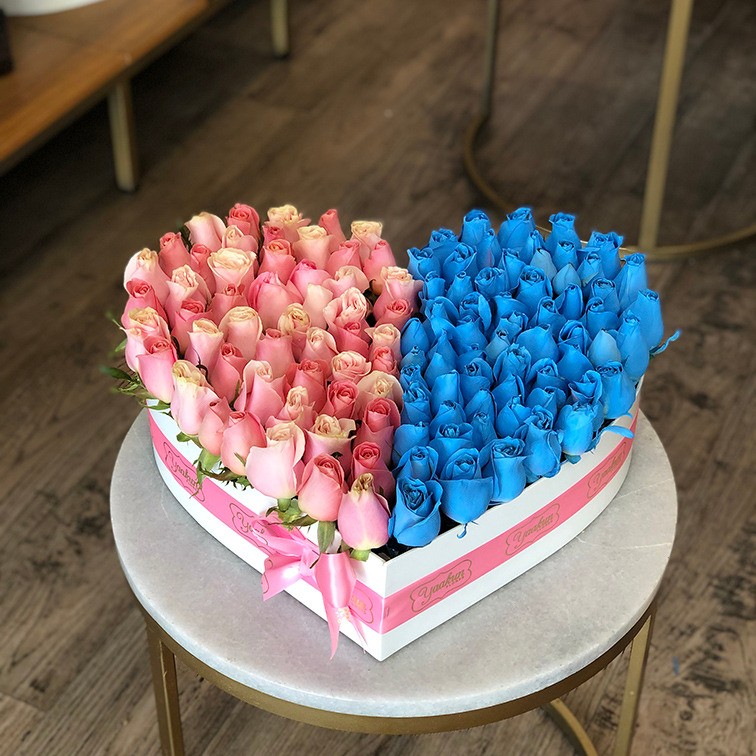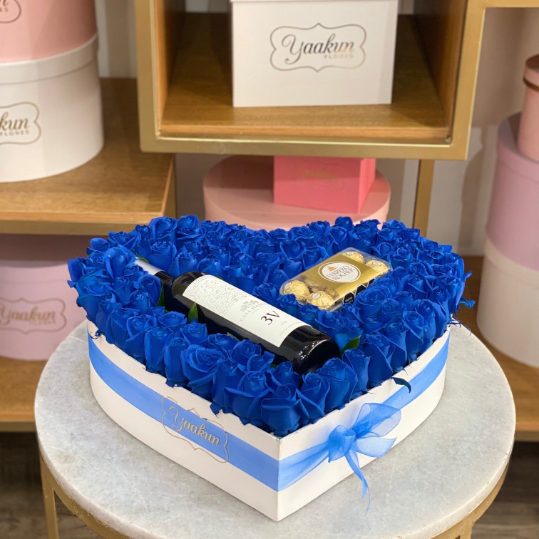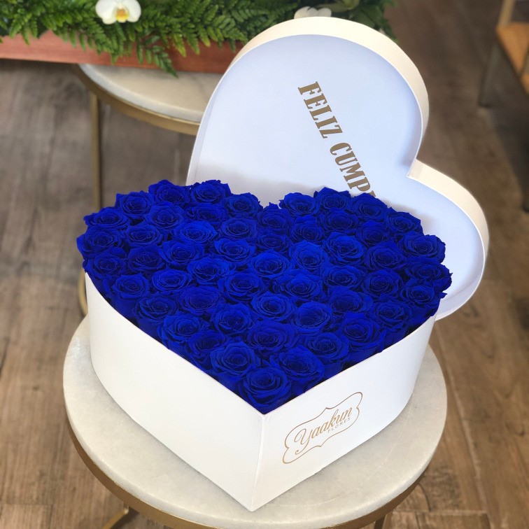 Hermoso arreglo floral con 200 rosas azules aproximadamente y girasoles en caja corazón negra